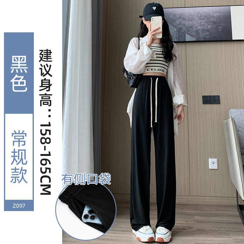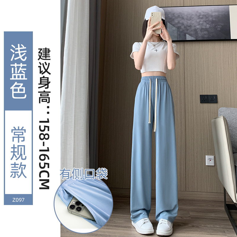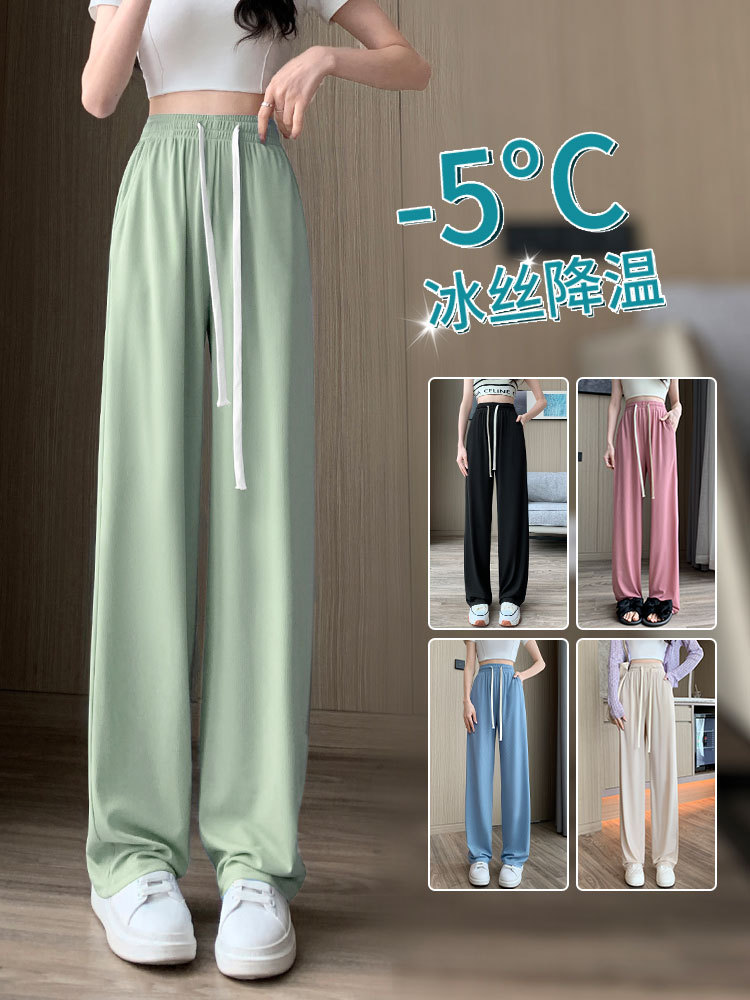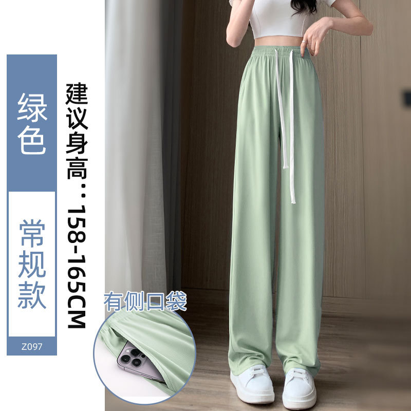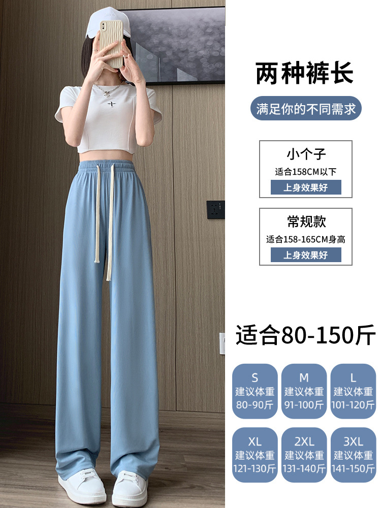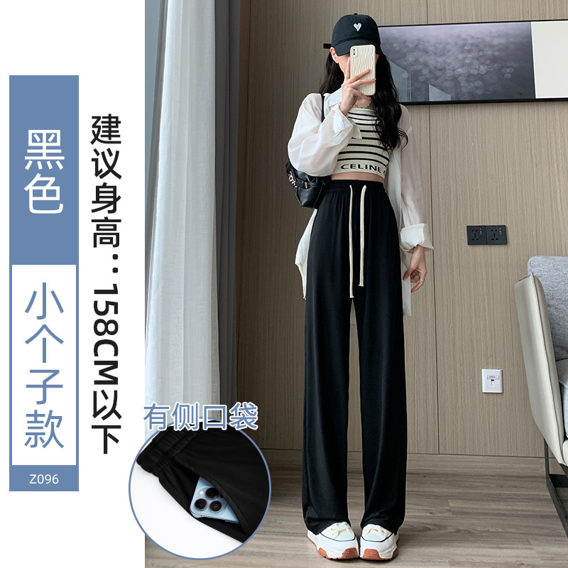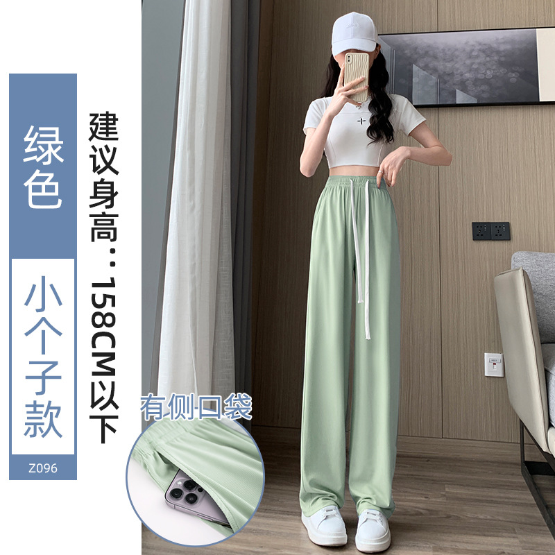 Fabric Name: Ice Silk Main Fabric Composition: Polyester Fiber Secondary Fabric Composition: Spandex Style: Straight-leg Pants Pant Style: Straight Pant Length: Long Pants Waist Type: High Waist Thickness: Thin Fashion Elements: Pockets Colors: [Regular Style] Black, [Regular Style] Blue, [Regular Style] Green, [Petite Style] Black, [Petite Style] Blue, [Petite Style] Green Sizes: S: 80-90 lbs, M: 90-100 lbs, L: 100-120 lbs, XL: 120-130 lbs, 2XL: 130-145 lbs Style Type: Japanese and Korean Casual Main Fabric Content: 90% (Inclusive) – 95% (Exclusive) Style: Casual Style Elasticity: Moderate Elasticity Cross-border Style Type: Elegant Temperament Secondary Fabric Content: Below 30% Craftsmanship: Drawstring