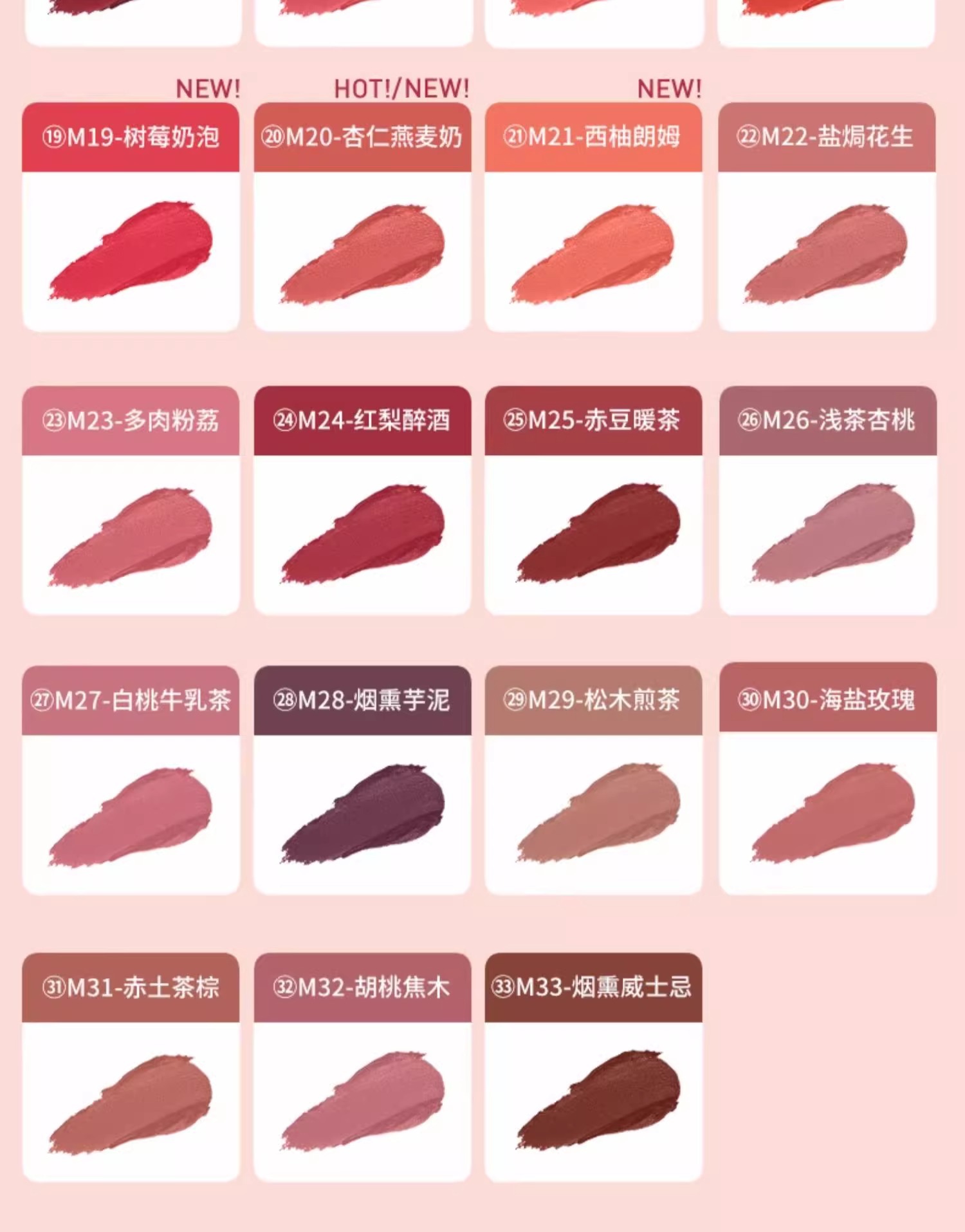 唇油 Y01 葡萄冰茶, 唇油 Y02 甜柚冰萃, 唇油 Y03白桃冰酪, #M01肉桂赤茶, #M02樱桃乳酪, #M04冰糖甜柿, #M06草莓跳跳糖, #M07海盐太妃糖, #M08酒渍车厘子, #M09焦糖巧克力, #M11焦糖烤栗, #M12枫糖姜饼, #M14莓莓酒酿, #M15生梅甜酒, #M16白桃甜茶, #M17无花果烤奶, #M18冷泡山楂, #M19树莓奶泡, #M20杏仁燕麦奶, #M21西柚朗姆, #M22盐焗花生, #M23多肉粉荔, #M24红梨醉酒, #M25赤豆暖茶, #M30海盐玫瑰, #M31赤土茶棕, #M32胡桃焦木, #M33烟熏威士忌