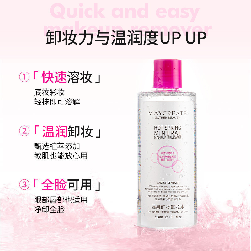 MAYCREATE Hot Spring Mineral Makeup Remover, 300ml, is designed to quickly and gently remove makeup and skin impurities, suitable for all skin types, including sensitive skin.