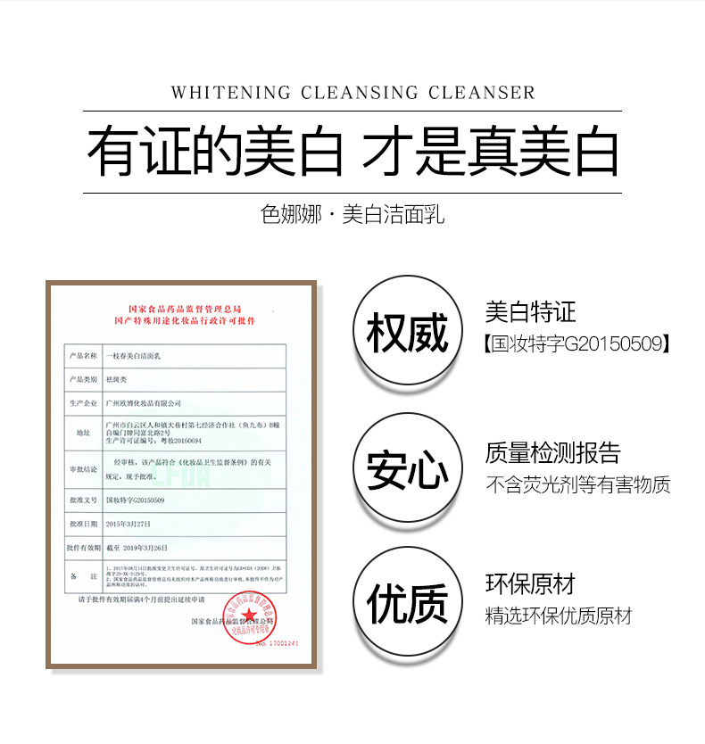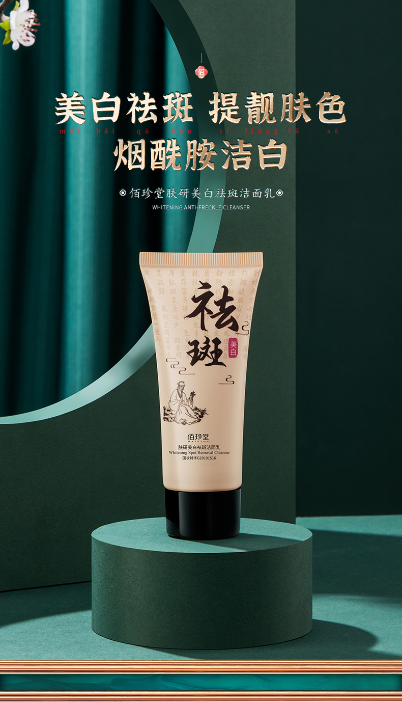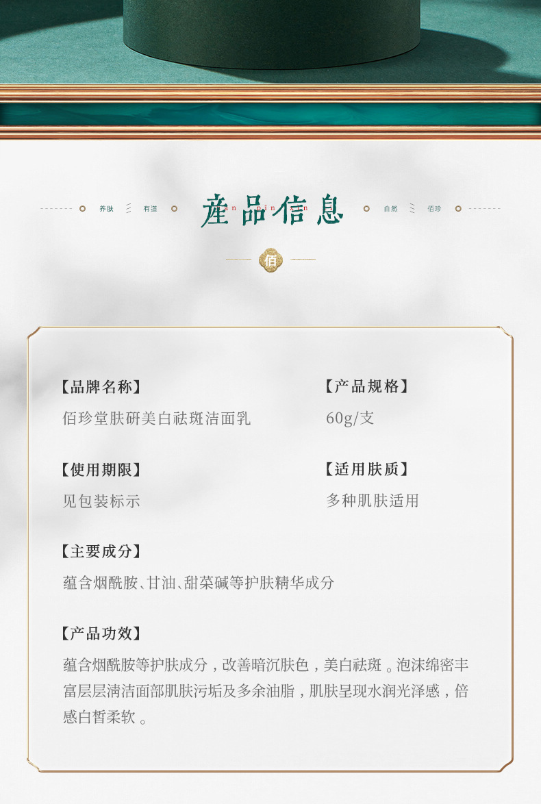 产品功效: 美白祛斑,改善暗沉肤色,清洁面部污垢及油脂,肌肤水润光泽,白皙柔软。