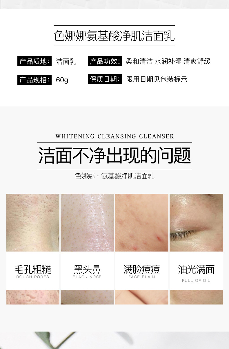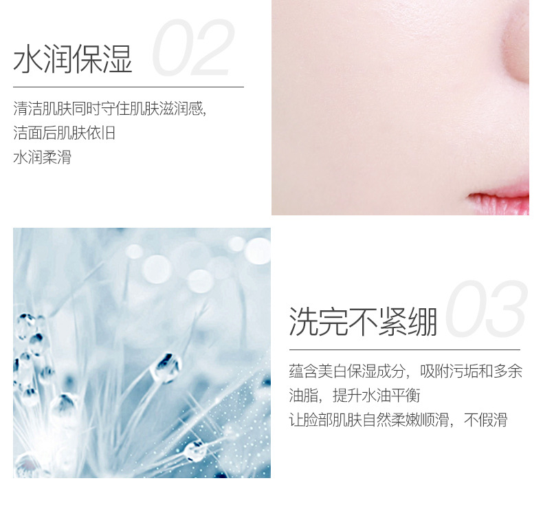 产品功效: 柔和洁净、美白保湿,改善暗沉肤色,减少黑头及油光,肌肤呈现水润光泽感。