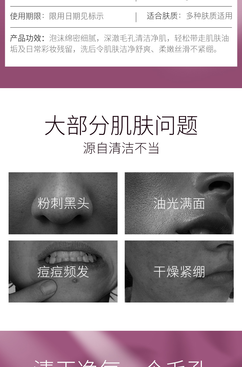 产品功效: 泡沫绵密,深层清洁毛孔,带走油垢及彩妆残留,令肌肤洁净、柔嫩不紧绷。