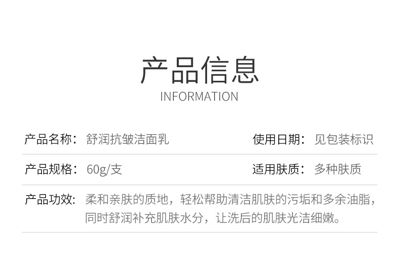 产品功效: 柔和清洁多余油脂,舒润补水,洗后肌肤光洁细嫩,具有抗皱效果。