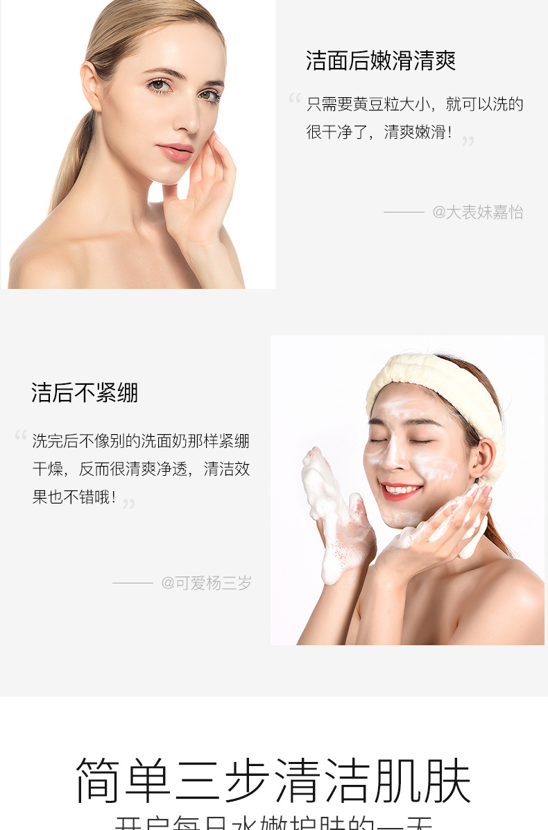 产品功效: 细腻泡沫温和清洁面部油脂,改善痘痘,保持肌肤娇嫩光滑。